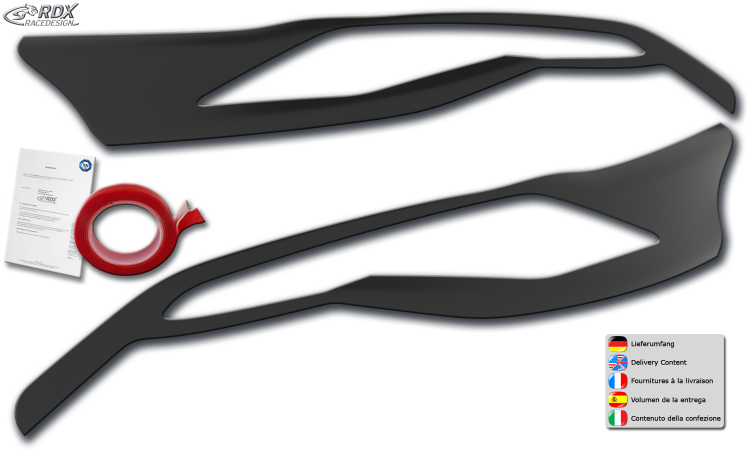 > Die Scheinwerferblenden werden einfach mit dem beiliegenden Montageklebeband auf das Scheinwerferglas geklebt