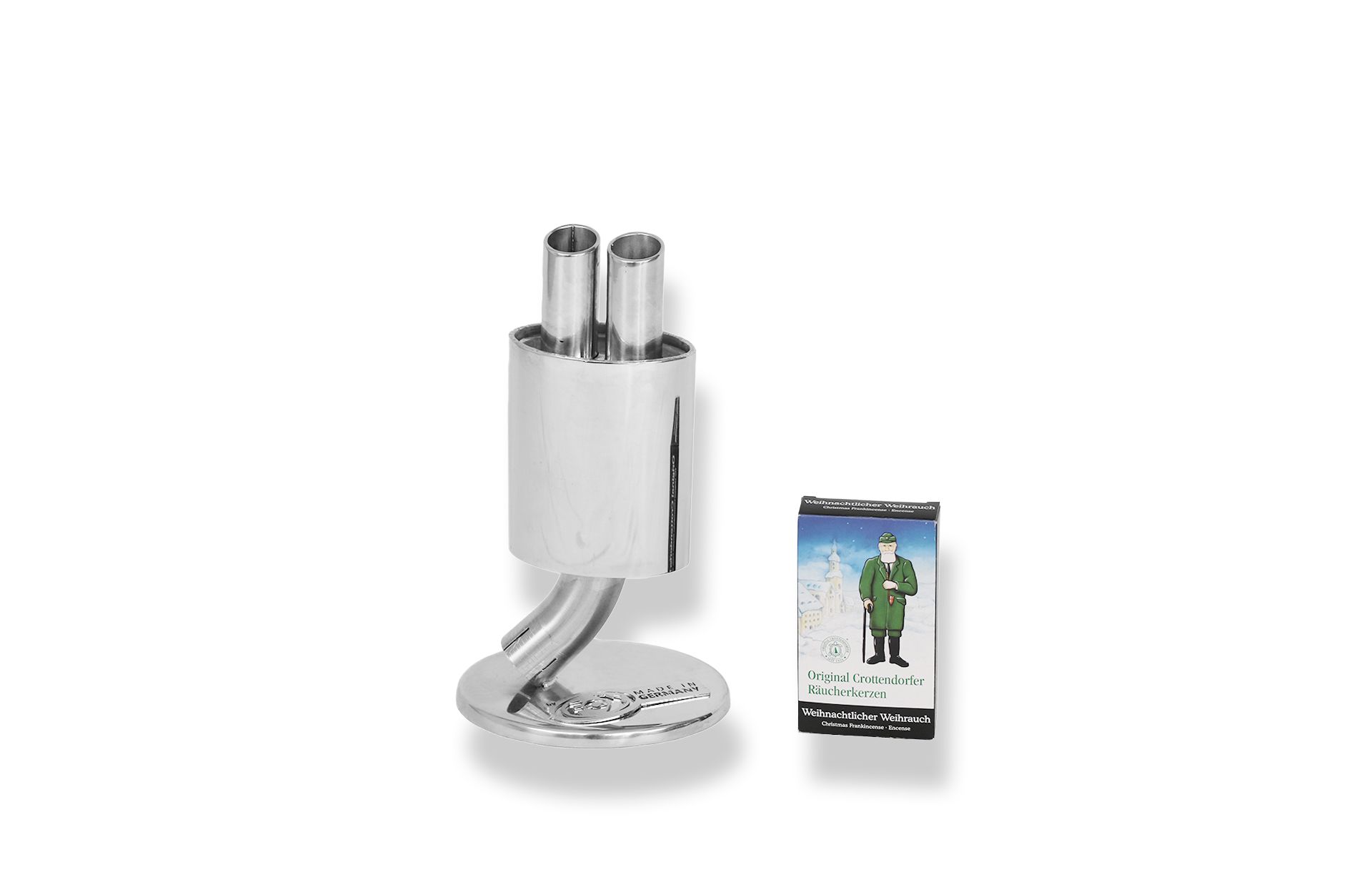 Im Lieferumfang enthalten ist eine Packung original Crottendorfer Räucherkerzen, die stilecht im Edelstahlgehäuse platziert werden können und einen angenehmen Duft verströmen.